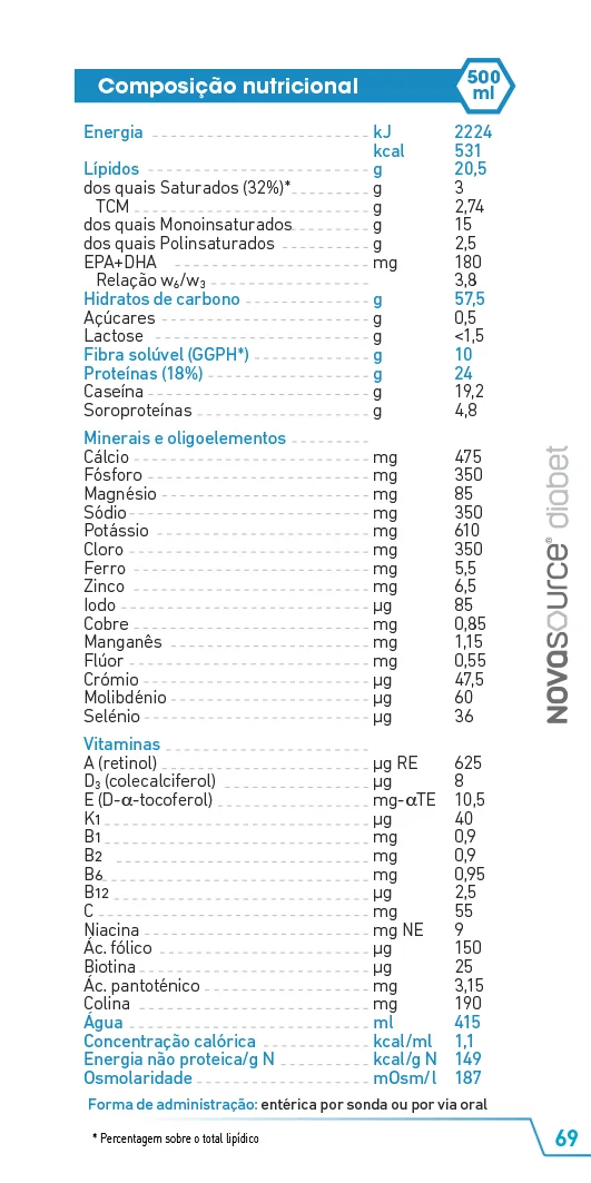 - NOVASOURCE Diabet dieta de baixo índice glicémico, normoproteica e isocalórica com fibra 100% solúvel para pacientes com nutrição entérica a longo prazo.